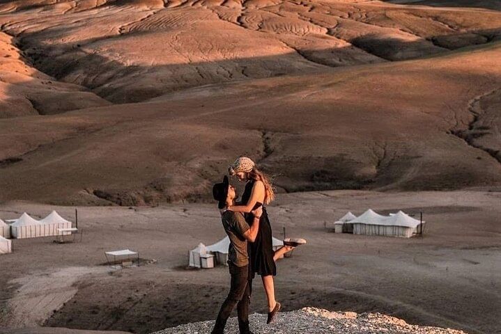 Escape to the Agafay Desert for a magical evening of camel rides, sunset views, and stargazing beneath the vast desert sky.