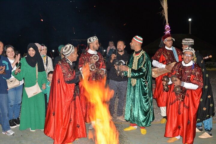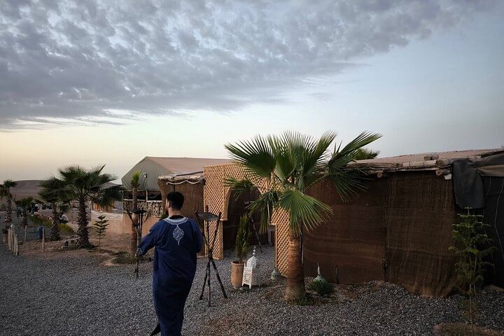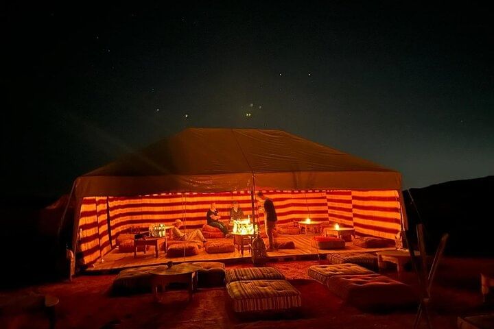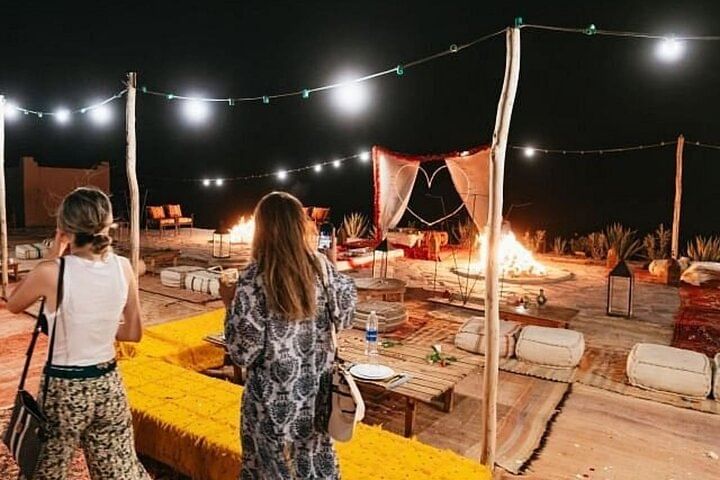 Enjoy a magical dinner in the Agafay Desert just outside of Marrakech. Savor a delicious meal under a tent canopy as you watch the sunset and look up at the stars - perfect for couples and families.